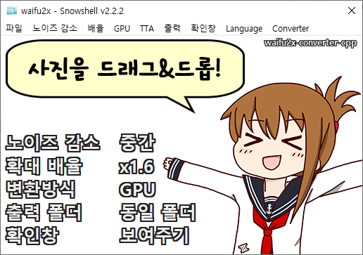 Waifu2x-snowshell은 사진 크기를 깨짐이 거의 없게 늘려주는 Waifu2x(http://waifu2x.udp.jp/)의 오픈소스를 기반으로 Yuki 님께서 코딩해서 제작하신 프로그램입니다.