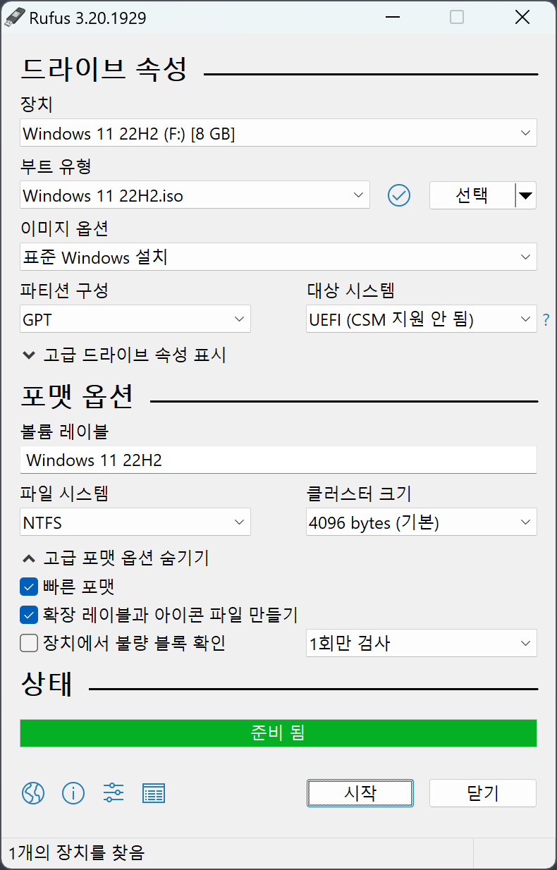 Rufus 3.21 (무설치판, 2022년 11월 28일 버전)